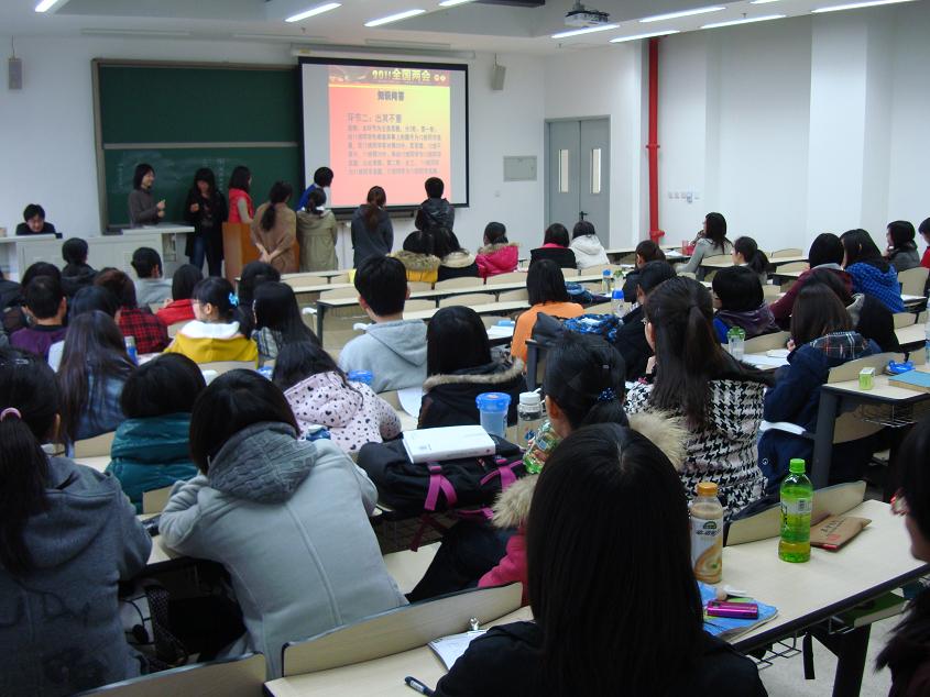 3 月16日下午四时,北航外国语学院2010级团支部组织于教3-205召开了一次“两会精神研讨会”,外国语学院分团委书记,2010级辅导员李丹以及2010级同学参加了此次会议。会议由11班团支书孟佩,21班团支书李月主持。
