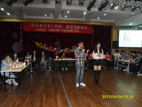 2012年4月12日晚7点整,由北航12系外国语学院研会与15系宇航学院研会合办的“我和春天有个约会”大型联谊交友晚会在北航晨兴剧场举行。此次晚会得到了两院领导的大力支持,两院研会的各位成员参与了整个晚会的策划、组织、宣传等工作。