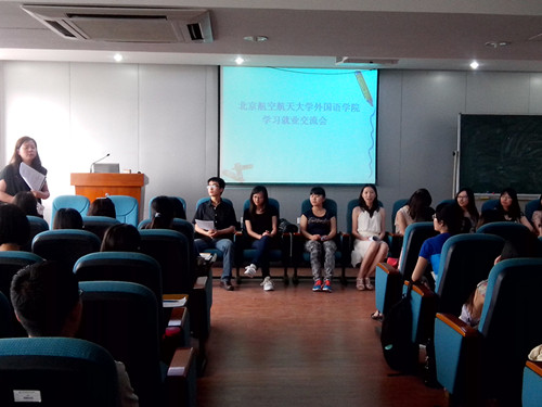 2013年5月22日下午4点,我校外国语学院“学习就业交流会”在如心楼806报告厅举行。本次交流会邀请到了我院2011级优秀研究生学长学姐与2012级学弟学妹们交流学习和就业方面的经验。