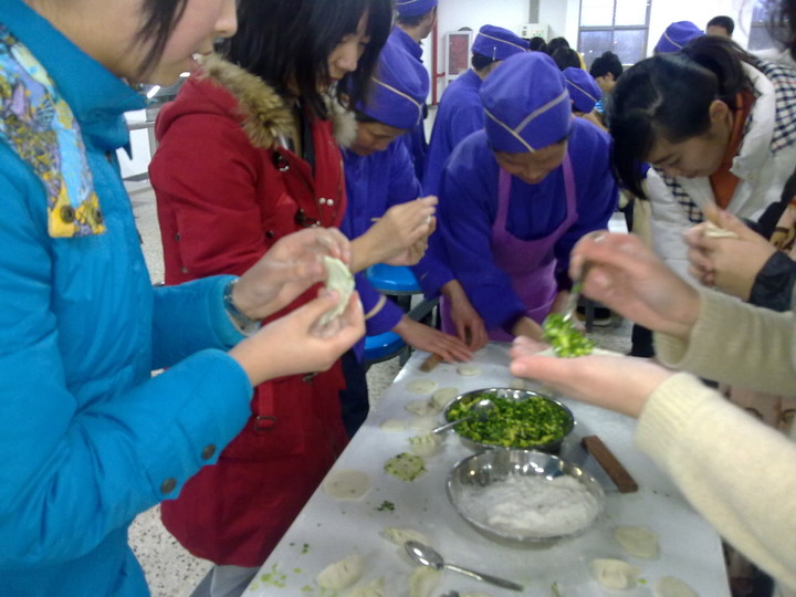 联欢会由三个环节组成,包括互动游戏,羽毛球小型竞赛以及大家一起包饺子。整个下午,学校餐厅里笑语连连,热闹非凡。其中不得不提的便是包饺子活动,和面、搓球、擀面皮、包饺子,大家纷纷找到自己拿手的项目,大显身手。当然还是要特别感谢北航食堂的师傅们,和我们一起欢度元旦,包饺子,并进行了一定的指导。我们的同学来自全国不同地区,各地有各地的包法,包出来的饺子也是各式各样,有传统型,还有元宝型,太阳形饺等等。看着自己包的饺子,大家的脸上都洋溢着兴奋与自豪。当然,同学们此时还不忘了娱乐,有的拿着手机拍照纪念,有些同学还趁机把面粉抹在别人脸上,食堂成了一片欢乐的海洋,到处充满了同学们的欢声笑语。同学们在师傅的指导下亲自煮了自己包的饺子,当一盘盘热腾腾的饺子端上来时,大家拿着碗与勺,争先恐后品尝自己亲手包的饺子,品尝着自己的劳动果实。
